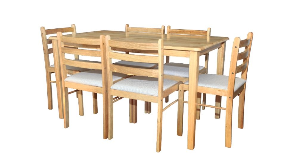 Solid Pine Table with a lacquered finish with 6 Upholstered chairs for added comfort