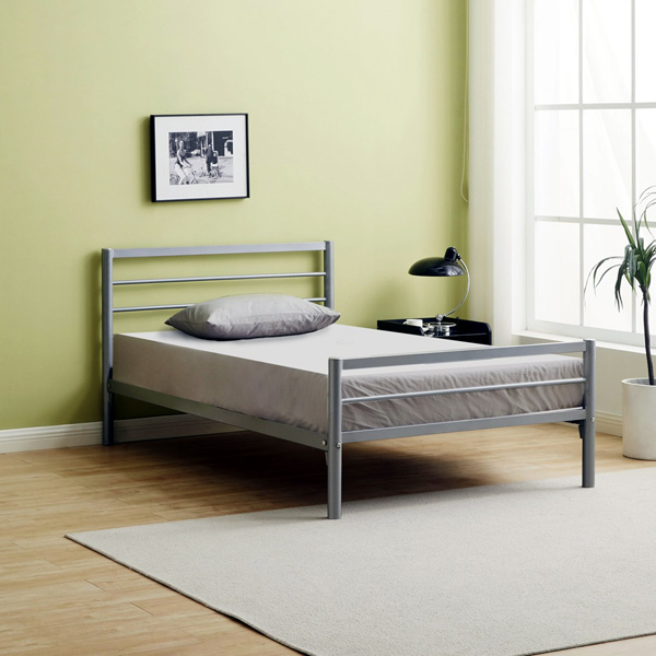 The bed frame has a simple design with metal support beams running along the headboard and foot-board and vertical posts on the sides. The bed frame comes in different sizes: Single, Small Double, Standard Double, and King ...