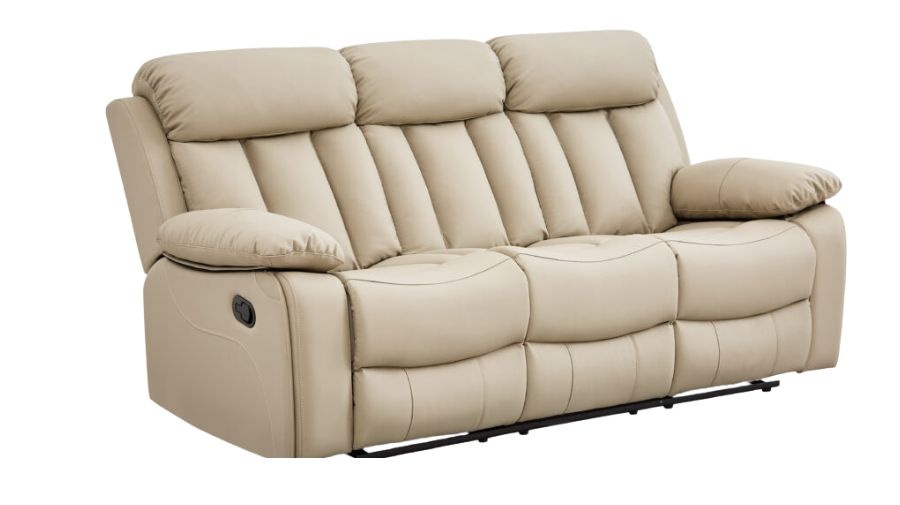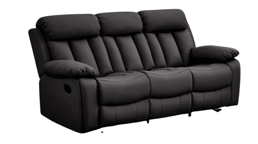 Made from eco-friendly leather, this chic manual recliner sofa combines elegance with comfort. You can select from a modern black or a classy taupe finish to enhance any room. It features a channel-tufted backrest, soft cushioning, and cushioned armrests.